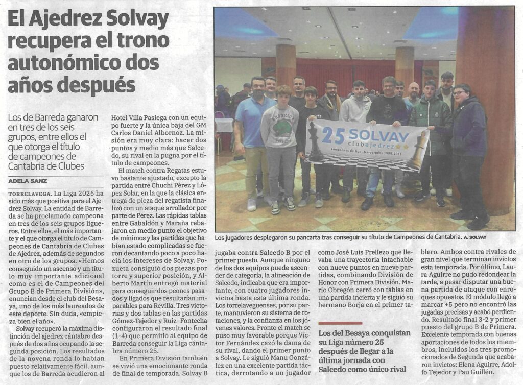 El Club Ajedrez Solvay ha sido protagonista en el Diario Montañés, que recoge en sus páginas el gran papel realizado por el equipo en la Liga Cántabra 2026.