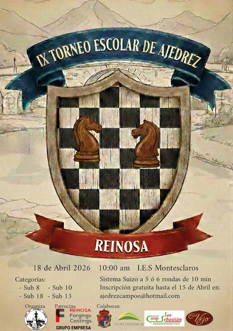 El 18 de abril de 2026, a partir de las 10:00, se celebrará en el IES Montesclaros de Reinosa la novena edición del Torneo de Ajedrez Escolar de Reinosa, organizado por el Club de Ajedrez Campoo. La competición se desarrollará hasta las 13:30 y estará dirigida a participantes de las categorías Sub 8, Sub 10, Sub 13 y Sub 18.
