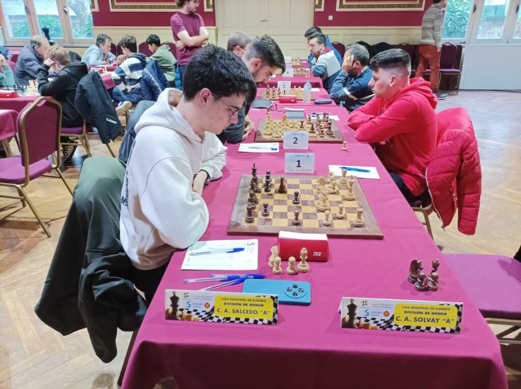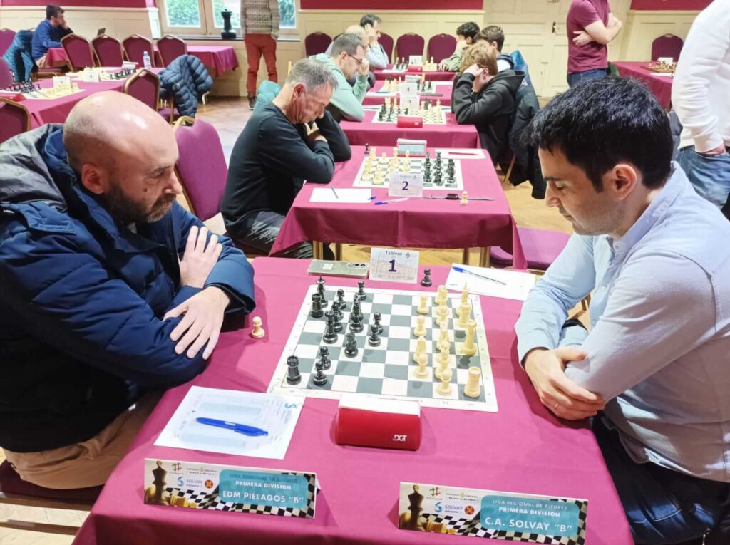 El Club de Ajedrez Solvay consiguió una victoria (3-2) casi decisiva ante el Salcedo; los dos puntos sumados nos permiten liderar la tabla a falta de la última jornada, que se disputará de modo unificado por todas las categorías del ajedrez cántabro en el Hotel Villa Pasiega de Hoznayo. Un empate ante el Regatas sería suficiente para lograr nuestra 25ª Liga. La victoria de esta semana ante el Salcedo se hizo esperar y pendió de un hilo hasta el final. El MI Bernal firmó unas rápidas tablas ante el MF Maté y ya cerca del apuro de tiempo Pozueta no pudo rechazar un ataque con torres y dama triplicadas contra el enroque blanco por la columna «f». Afortunadamente para nuestros intereses, el MF Rodríguez Fontecha, con una siciliana, pudo convertir el peón pasado «d», habiendo doblado dos peones blancos en «a». Poco después, el GM Albornoz impuso su calidad técnica frente al MF G. Falagán. La partida más disputada y complicada tuvo como protagonistas al MI Tejedor y a Víctor Moreno. En una posición con Torre y 3 peones de Enrique ante caballo, alfil y 2 peones de Víctor se firmó la paz que nos otorgó el medio punto necesario para que los puntos se quedasen en casa. El desenlace final se producirá el próximo sábado en Hoznayo, aunque a priori se presenta muy favorable a nuestros intereses.