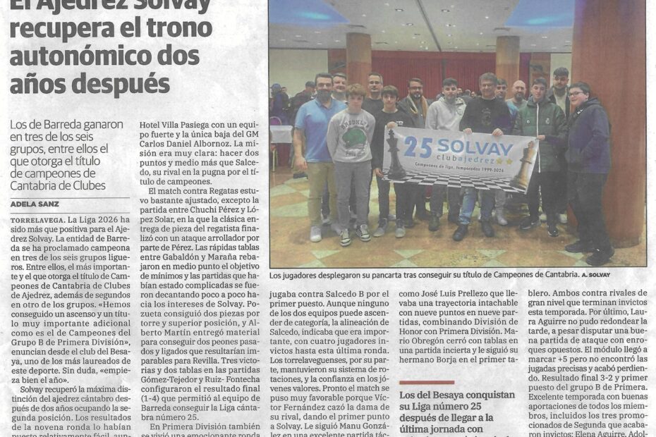 El Club Ajedrez Solvay ha sido protagonista en el Diario Montañés, que recoge en sus páginas el gran papel realizado por el equipo en la Liga Cántabra 2026. El artículo destaca los excelentes resultados obtenidos esta temporada, en la que…
